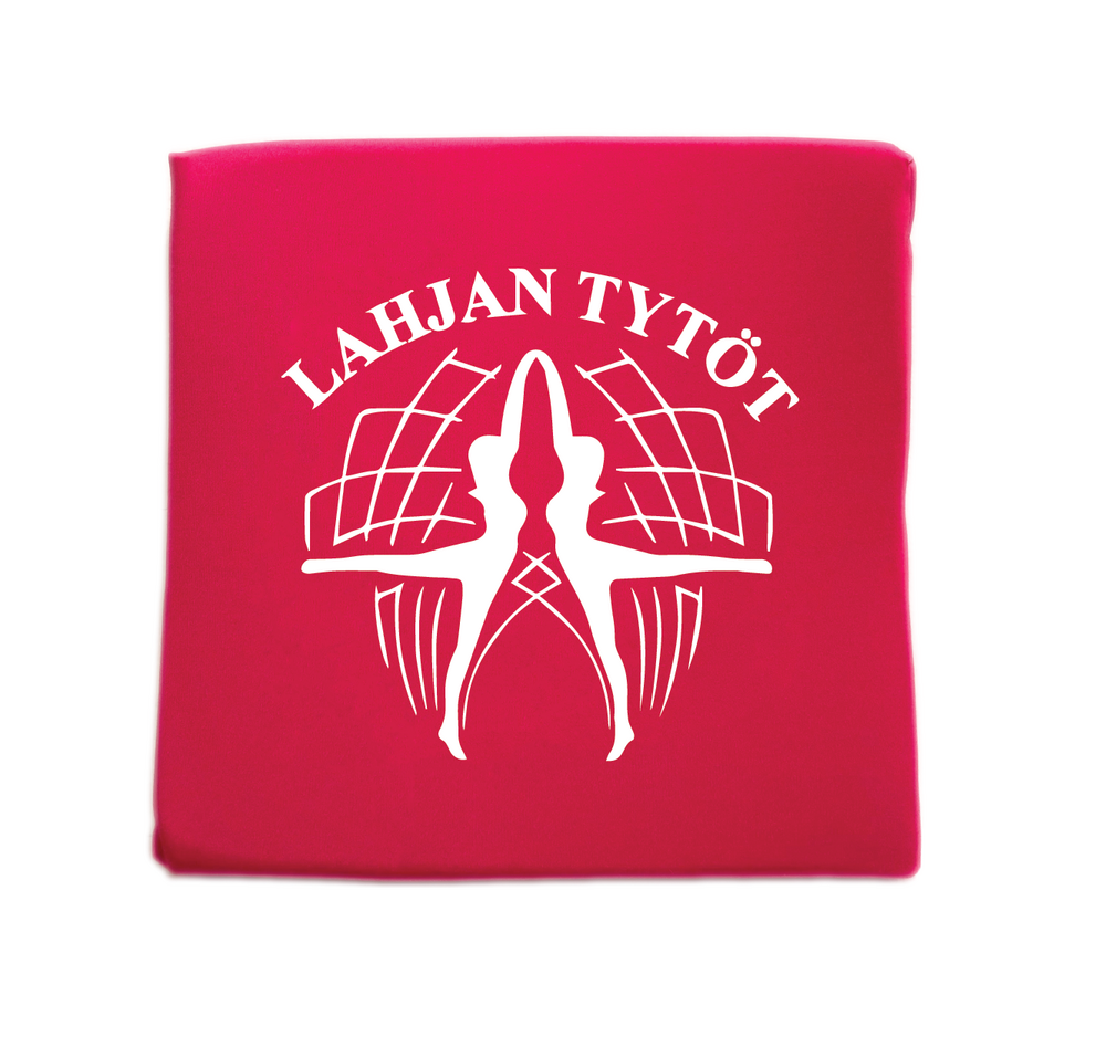 Voimistelutyynyn koko on 30x30cm. Pinkki päällinen, valkoinen Lahjan Tytöt-logo päälipuolella, sisällä vaahtomuovipatja. Voimistelutyynyn hinta on 15 euroa.