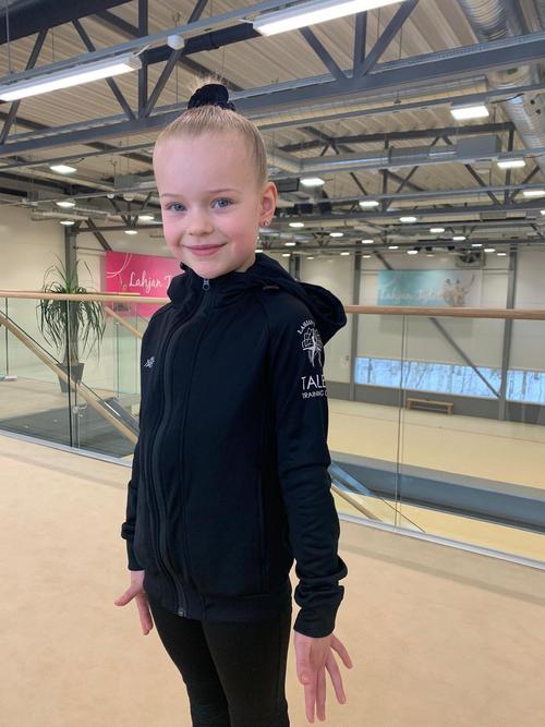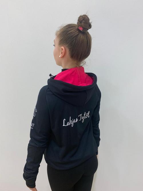 Uudessa korkealaatuisessa, tyköistuvassa teknisessa vetoketjuhupparissa on vetoketjutaskut, hupussa kangas on kaksinkertainen ja hupun sisäosa on pinkki. Huppua on mahdollista kiristää kiristyskuminauhalla. Hupparin sisäpinta on miellyttävän pehmeä. Lahjan Tytöt-teksti hupparin selässä, vasemmassa hihassa Lahjan Tytöt ja Talent Training Center logot. Painatukset valkoisella. Hupparin hinta on 49 euroa.