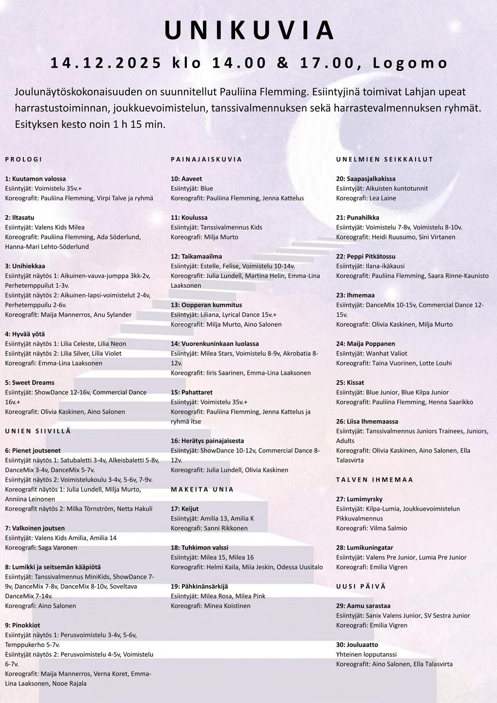 Lahja Sportin joulunäytös 2025 "Unikuvia" järjestetään Logomossa sunnuntaina 14.12. klo 14.00 & 17.00. Lipunmyynti avautuu perjantaina 14.11. klo 9.00. Liput myy lippu.fi ja hinta on 20 € + lippu.fi…