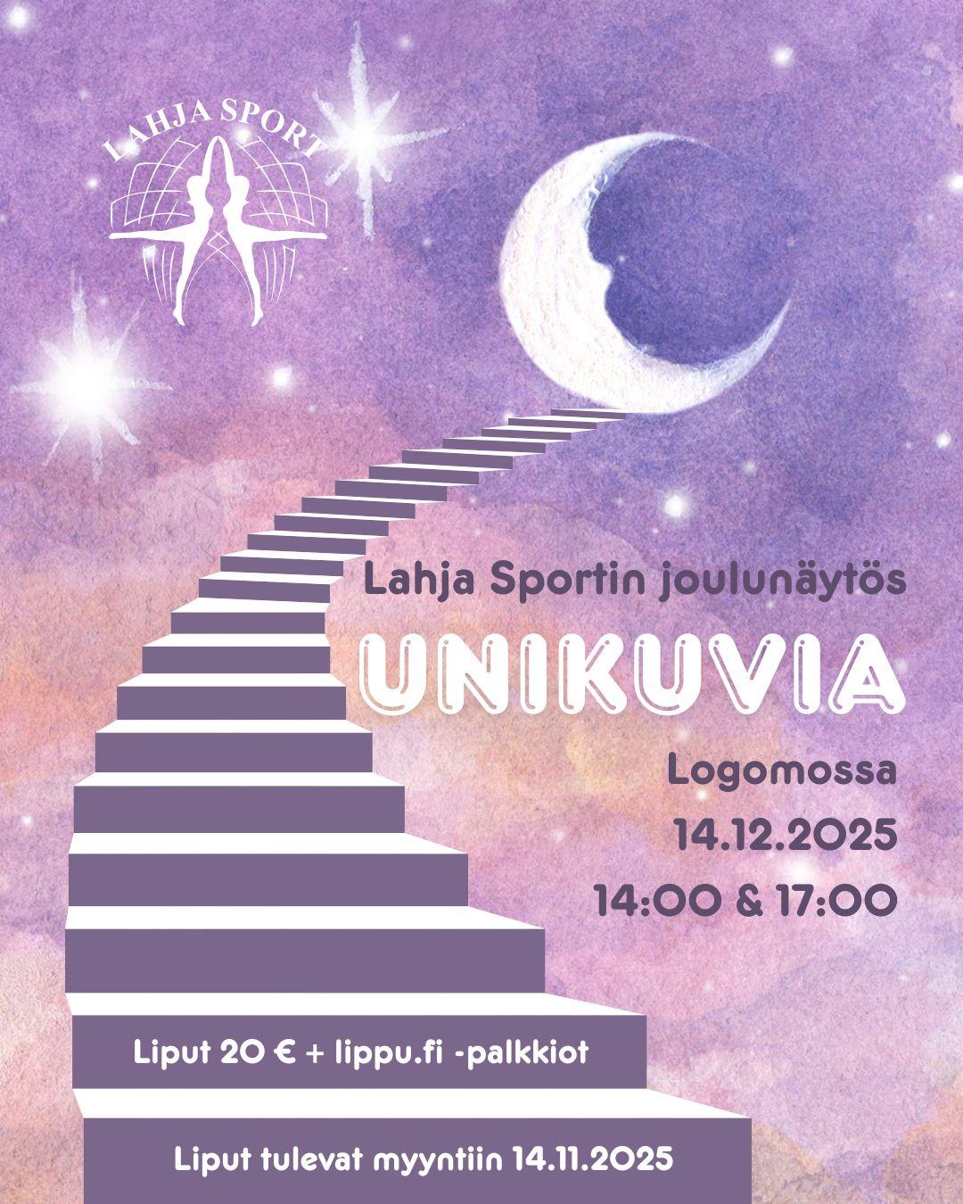 Lahja Sportin joulunäytös 2025 "Unikuvia" järjestetään Logomossa sunnuntaina 14.12. klo 14.00 & 17.00.